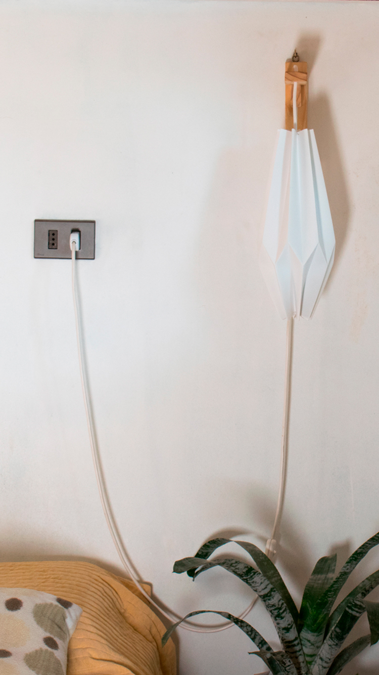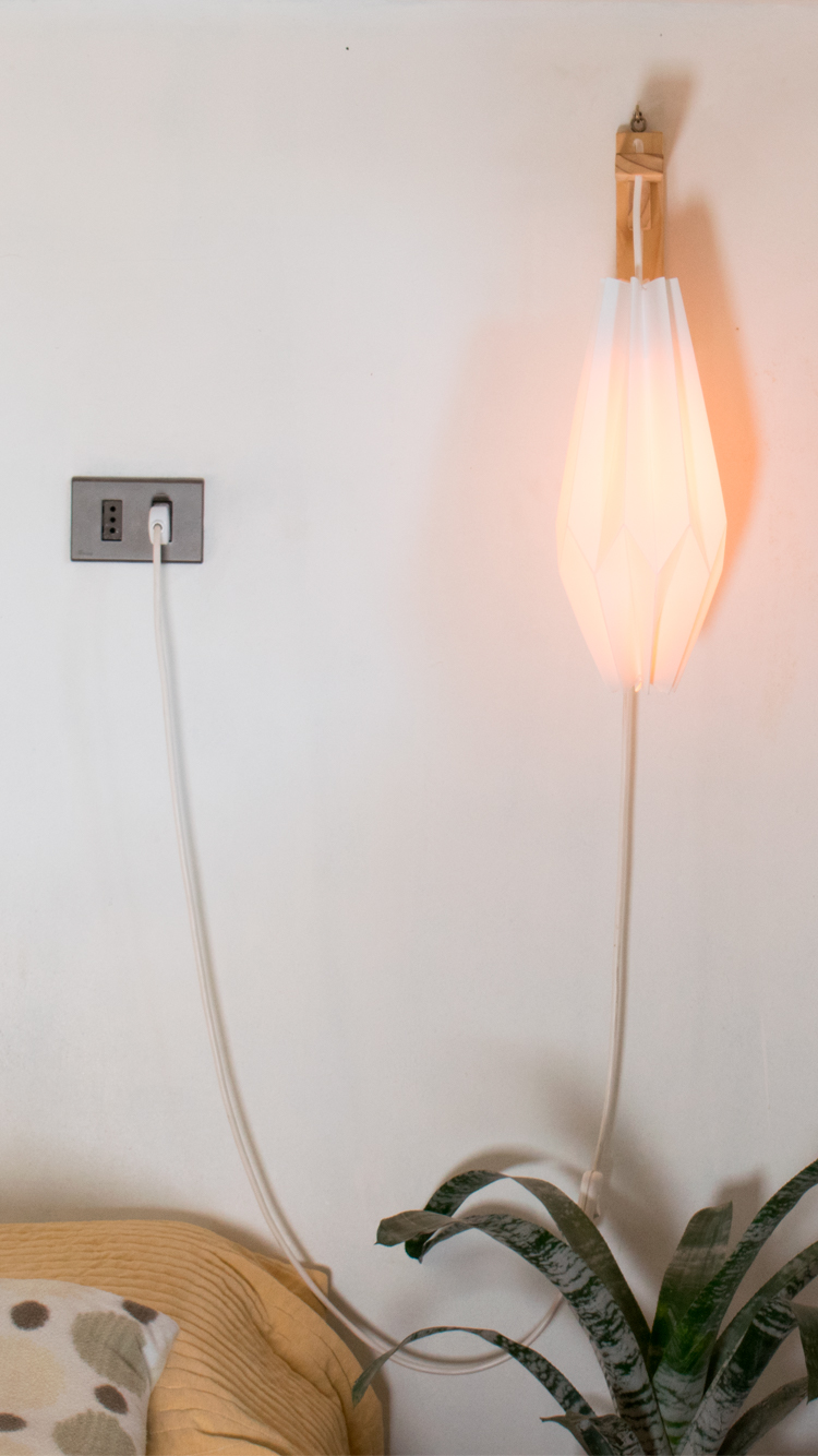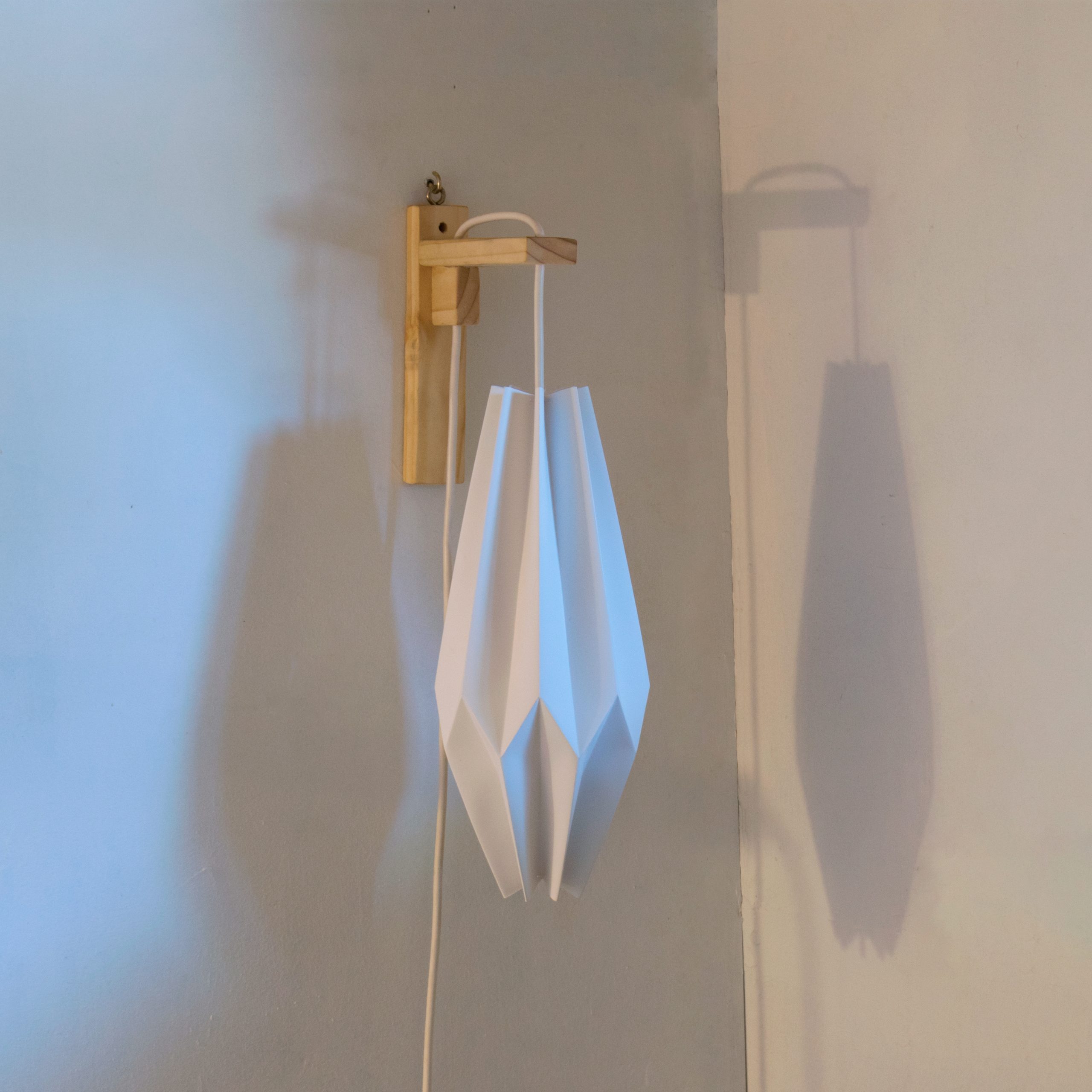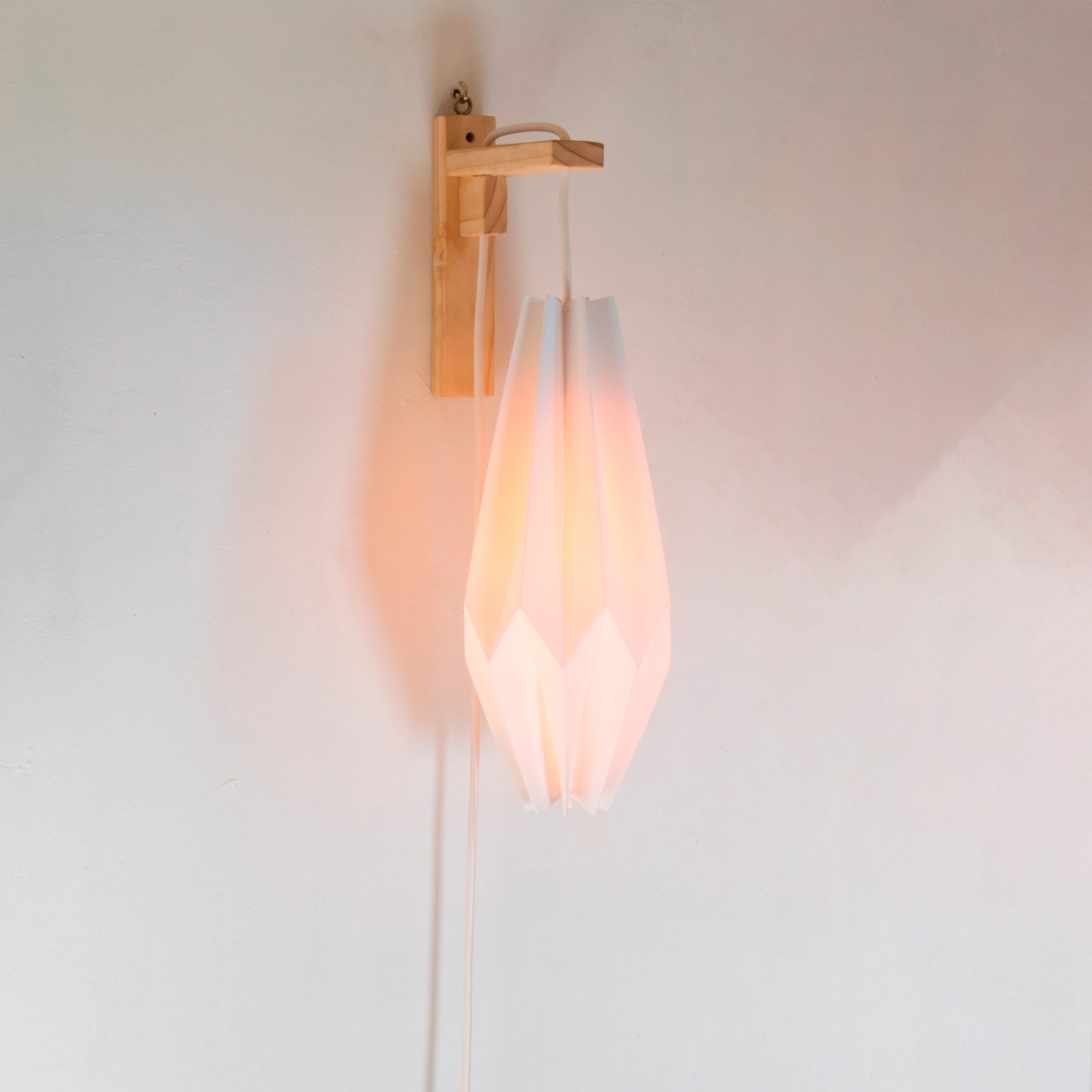 Amatista de muro es el segundo diseño de lámpara de muro de la colección “Pliegues”. Este diseño amplía la familia de lámparas sustentables para el hogar incorporando una nueva tipología de fácil instalación. Esta lámpara incluye un cable de 2,3 mt e interruptor volante, la instalación es bastante simple y solo requiere una perforación para colgar la estructura soportante. Usamos madera de pino sellada con aceite de coco para la estructura. Ideal para iluminar espacios interiores, livings, arrimos, recibidores y veladores de dormitorio.