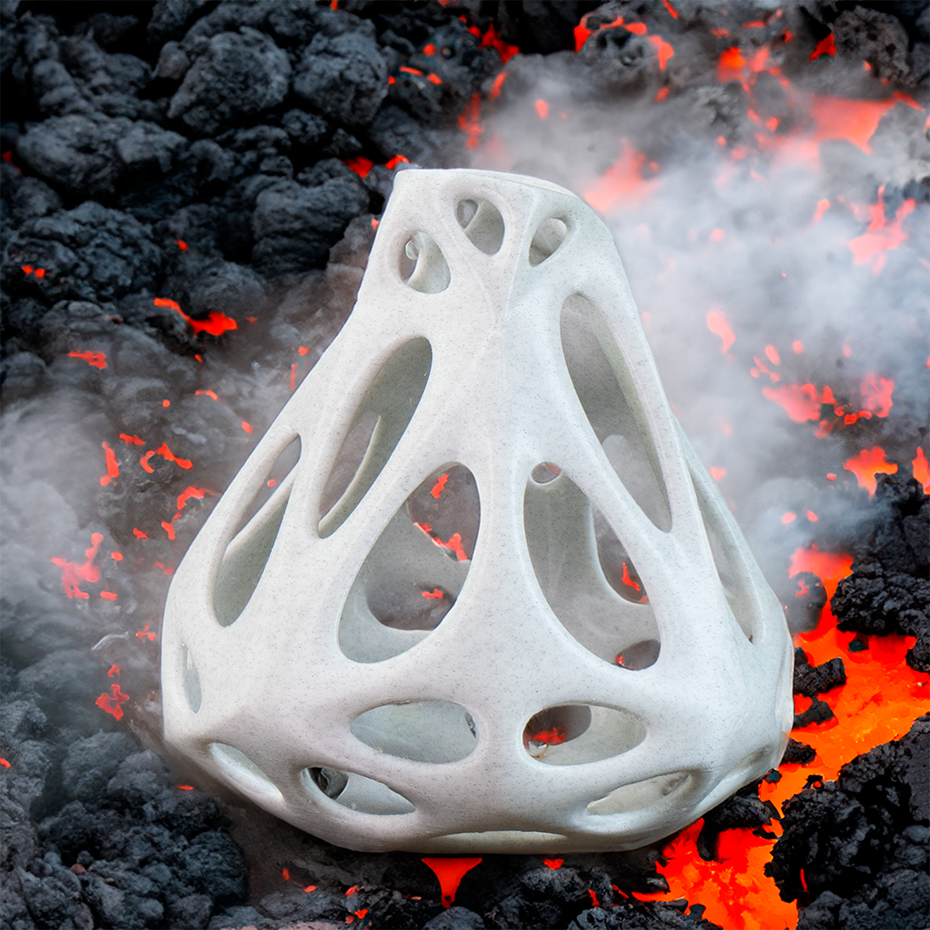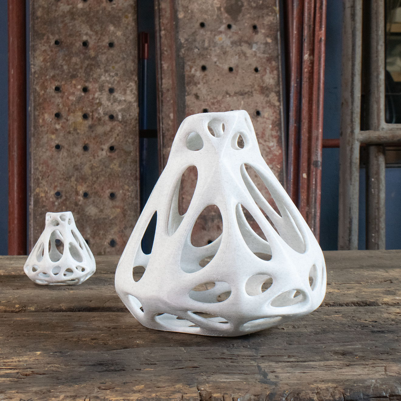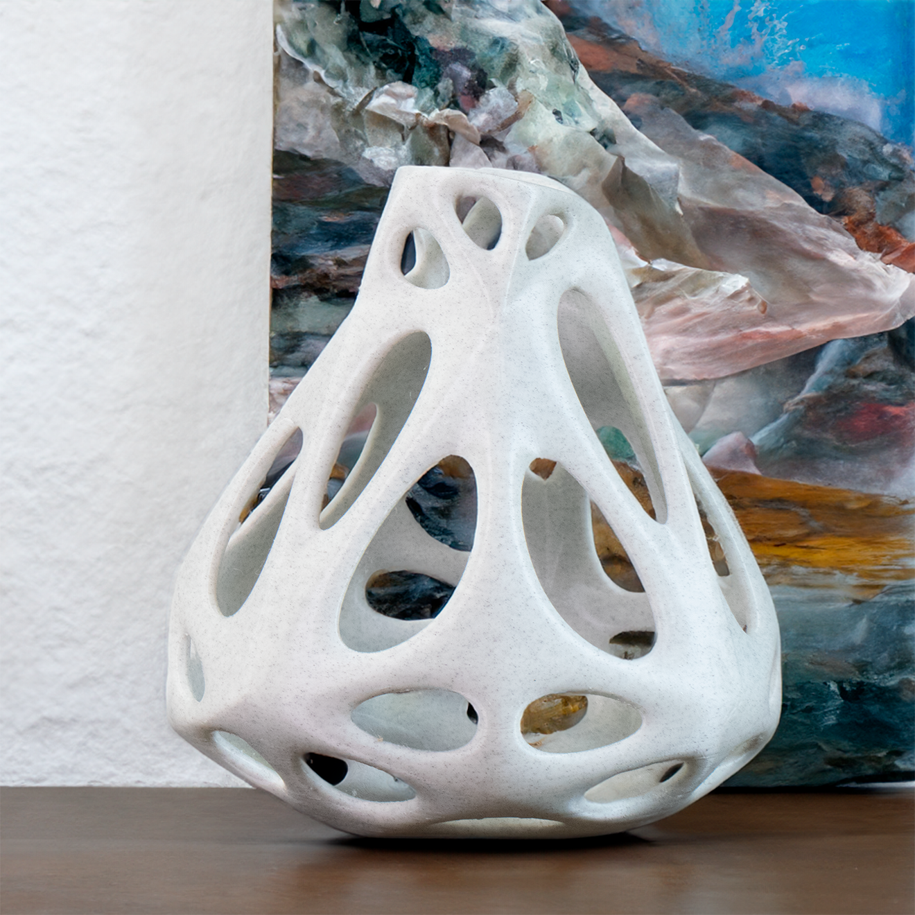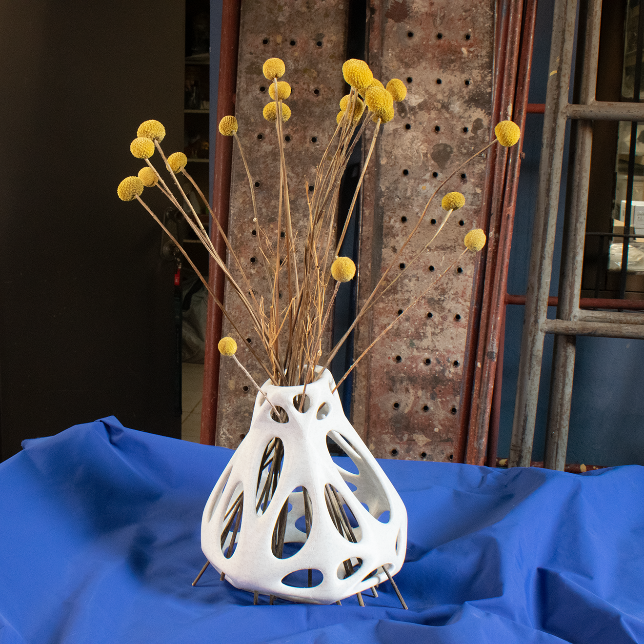Diluyendo los limites de un contenedor o vasija a través de la geometría voronoi, Inspirada en formas orgánicas presentes en la naturaleza como el velo del hongo Dictyophora indusiata, esta vasija puede contener flores secas o ser la ornamentación central de tus espacios sin la necesidad de otro elemento.